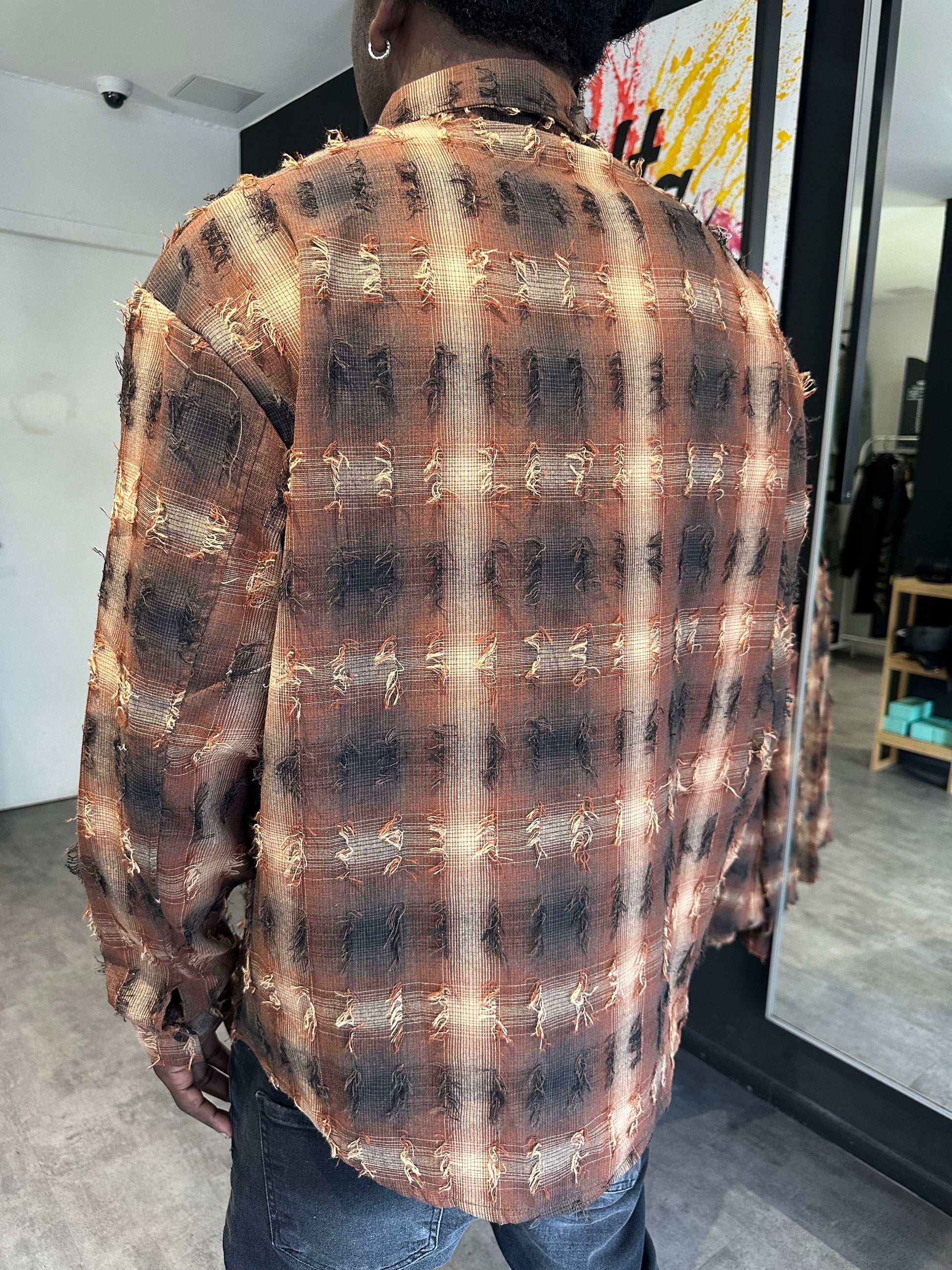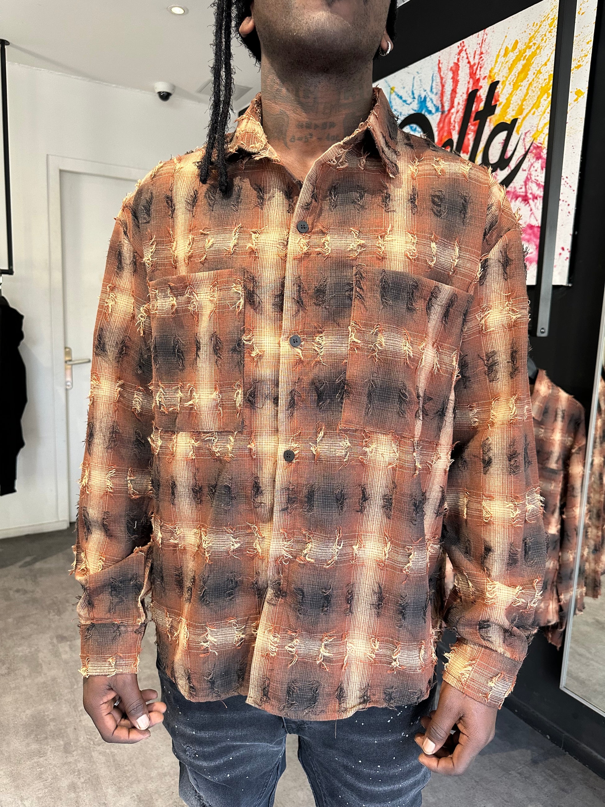 Cette chemise se distingue par son tissu texturé au rendu artisanal et son effet destroy assumé, qui lui confèrent une identité forte et contemporaine. Son motif quadrillé subtilement délavé, associé aux fils apparents, apporte profondeur et caractère à la pièce. Conçue dans une matière légère et respirante, elle offre un tombé naturel et un confort optimal au quotidien.