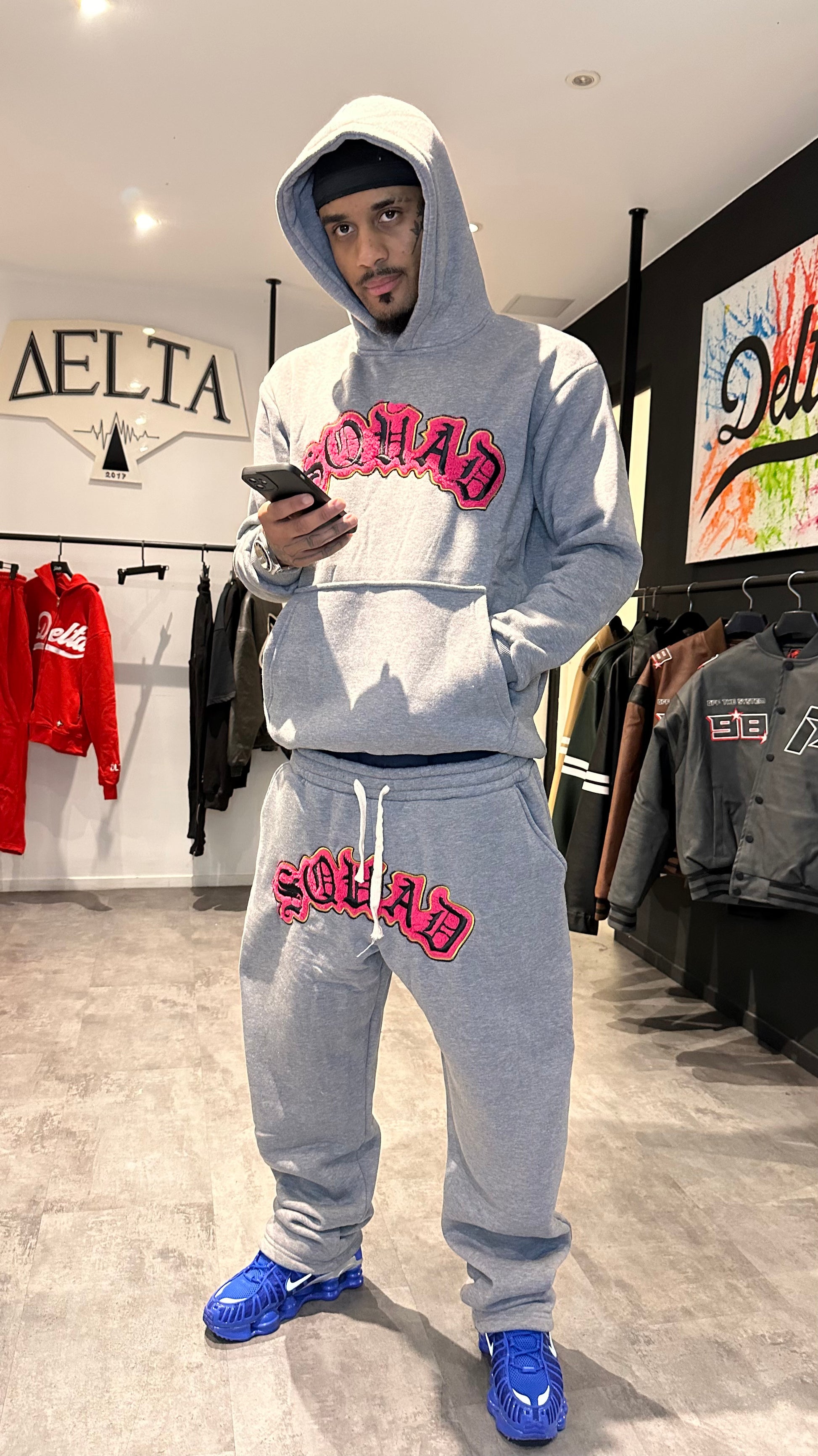Affirme ton style avec l’ensemble SQUAD, composé d’un hoodie à capuche et d’un pantalon de jogging assorti. Confortable et tendance, il se distingue par son inscription SQUAD en relief effet patch bouclette, placée sur la poitrine et sur le bas du jogging.