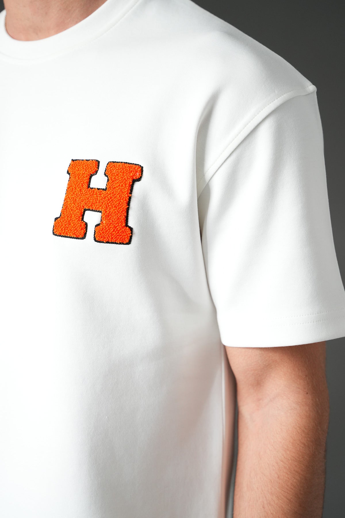 Le t-shirt à col rond et le pantalon assorti créent une tenue harmonieuse, tandis que le patch H texturé apporte une signature visuelle distinctive.