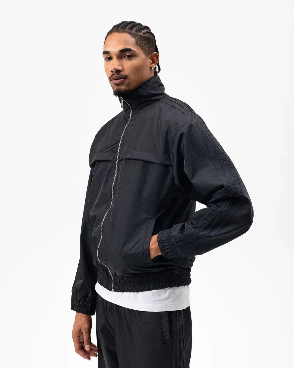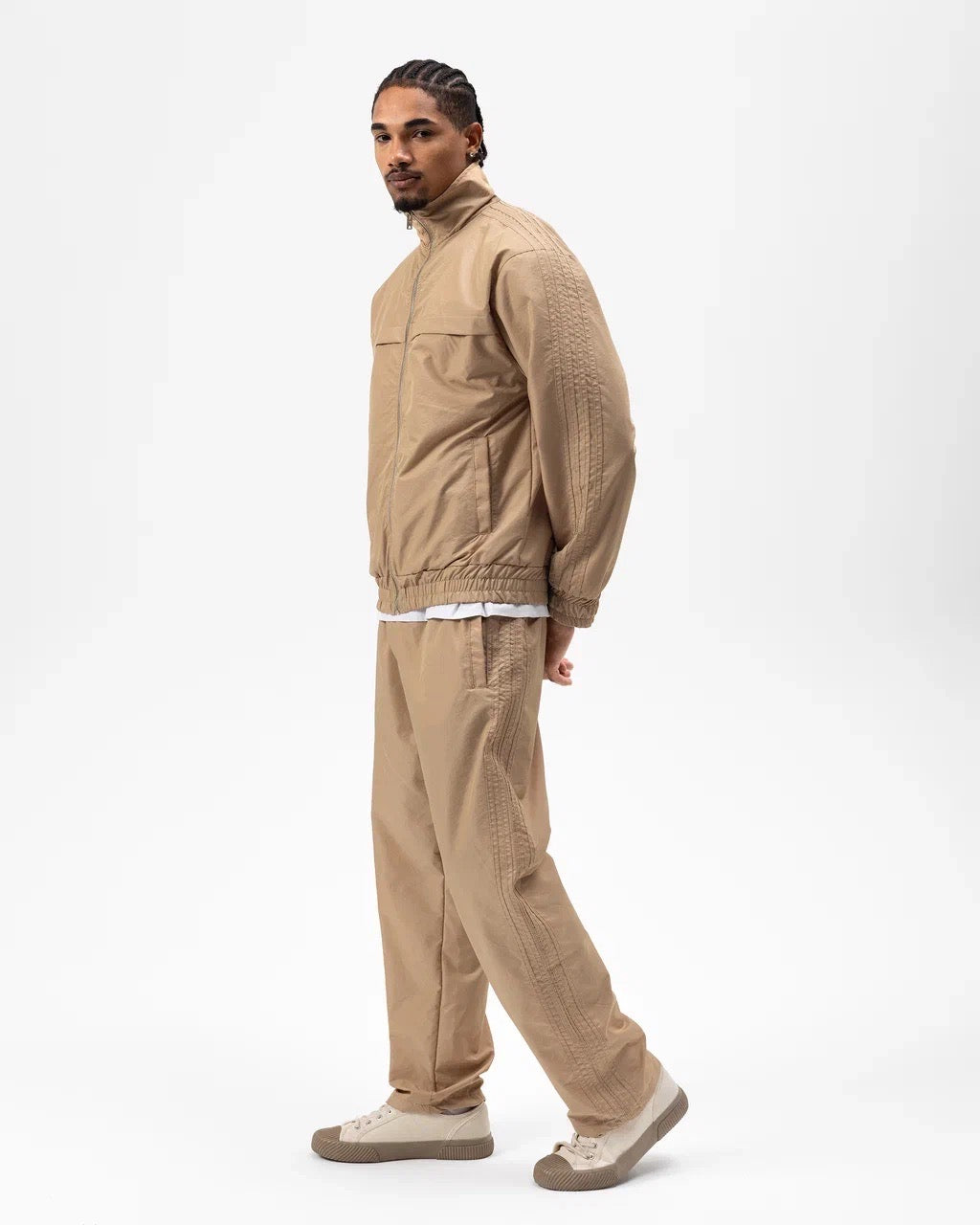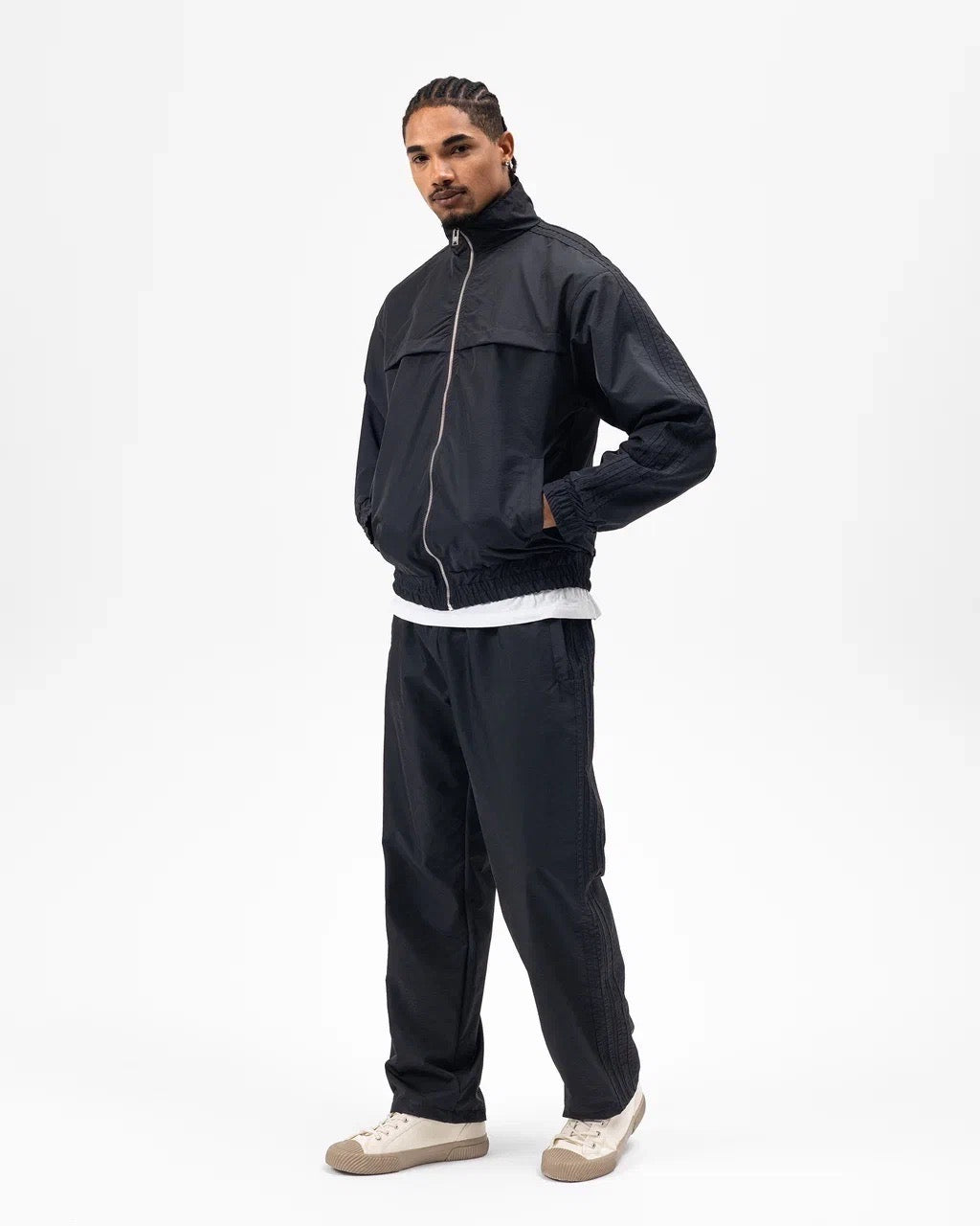 La veste zippée à col montant apporte une touche dynamique, tandis que le pantalon assorti assure une silhouette nette et décontractée. Les finitions soignées et les détails texturés sur les manches et les côtés renforcent son caractère urbain.