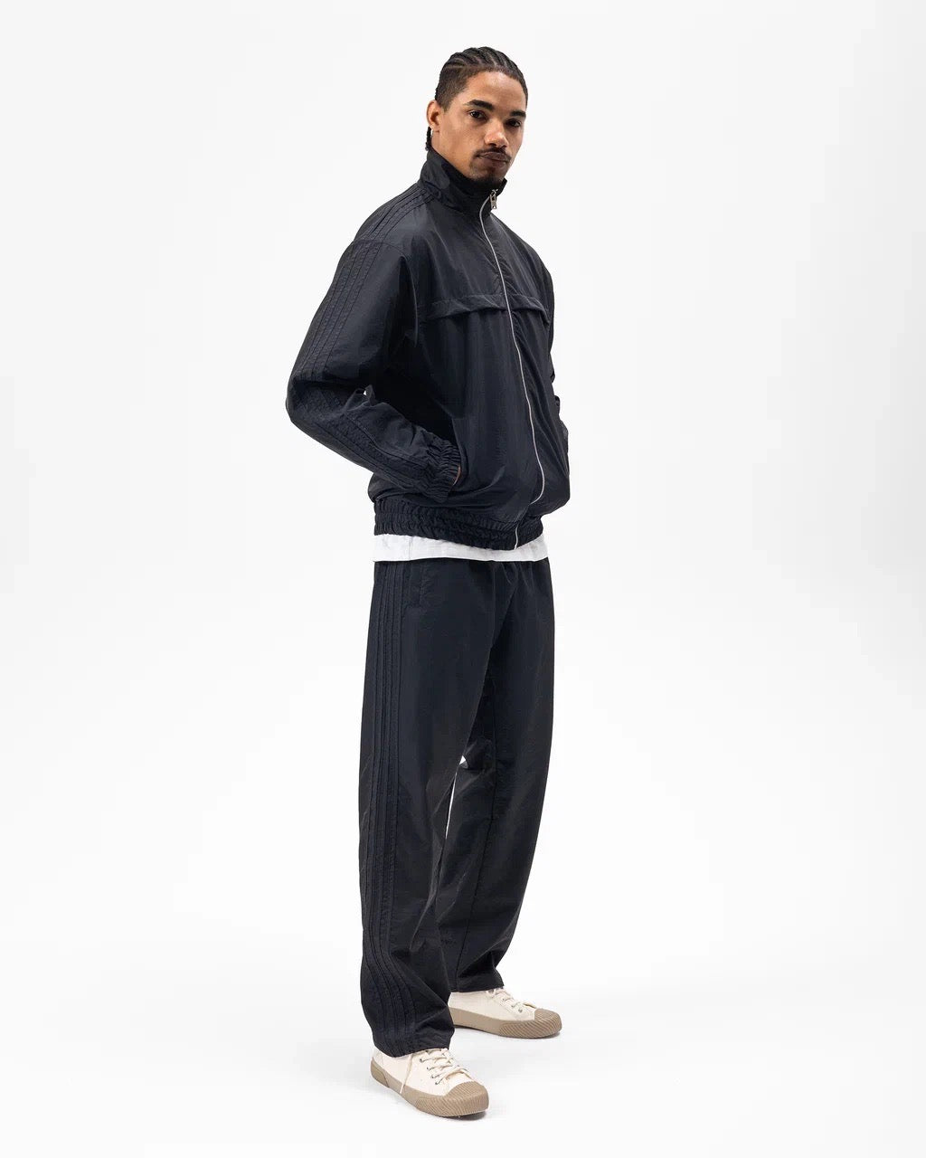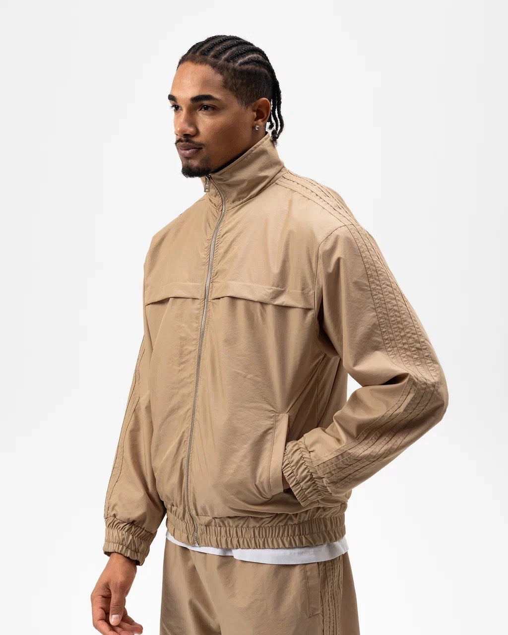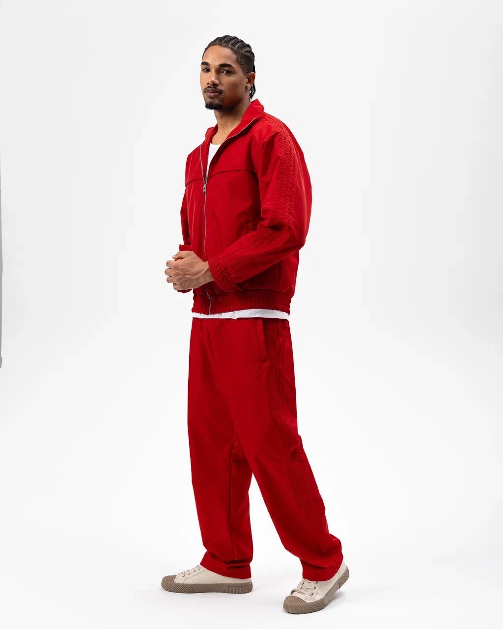 La veste zippée à col montant apporte une touche dynamique, tandis que le pantalon assorti assure une silhouette nette et décontractée. Les finitions soignées et les détails texturés sur les manches et les côtés renforcent son caractère urbain.