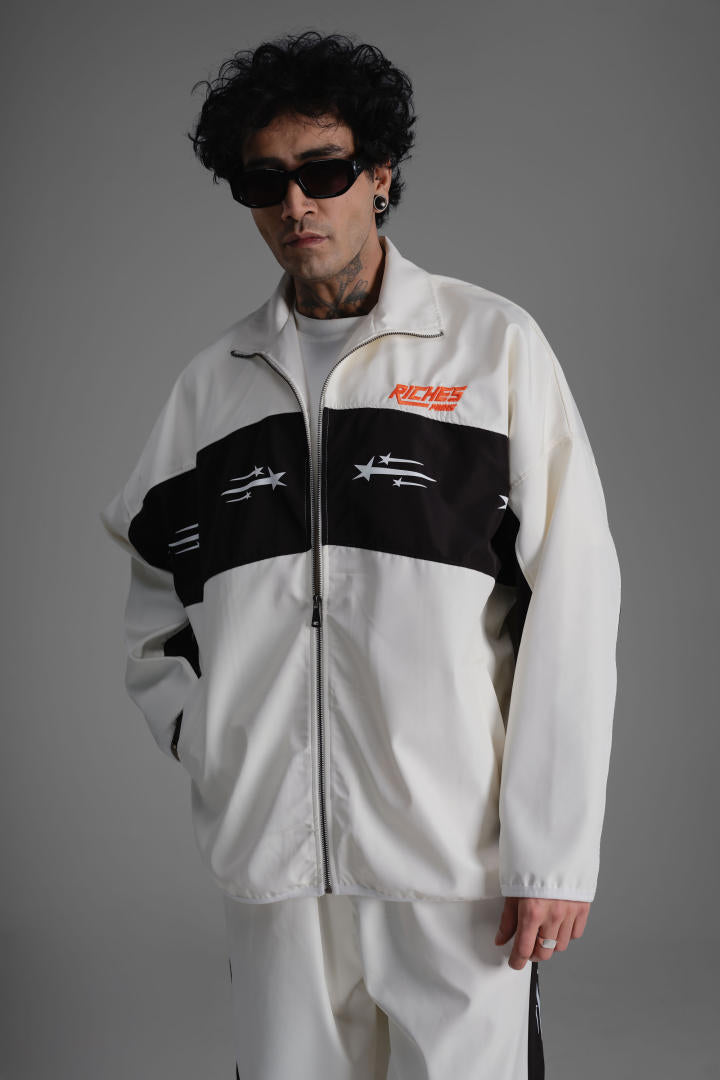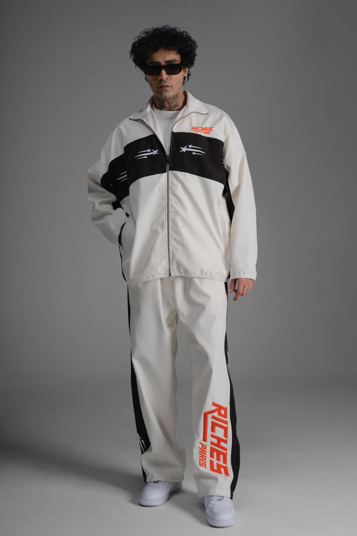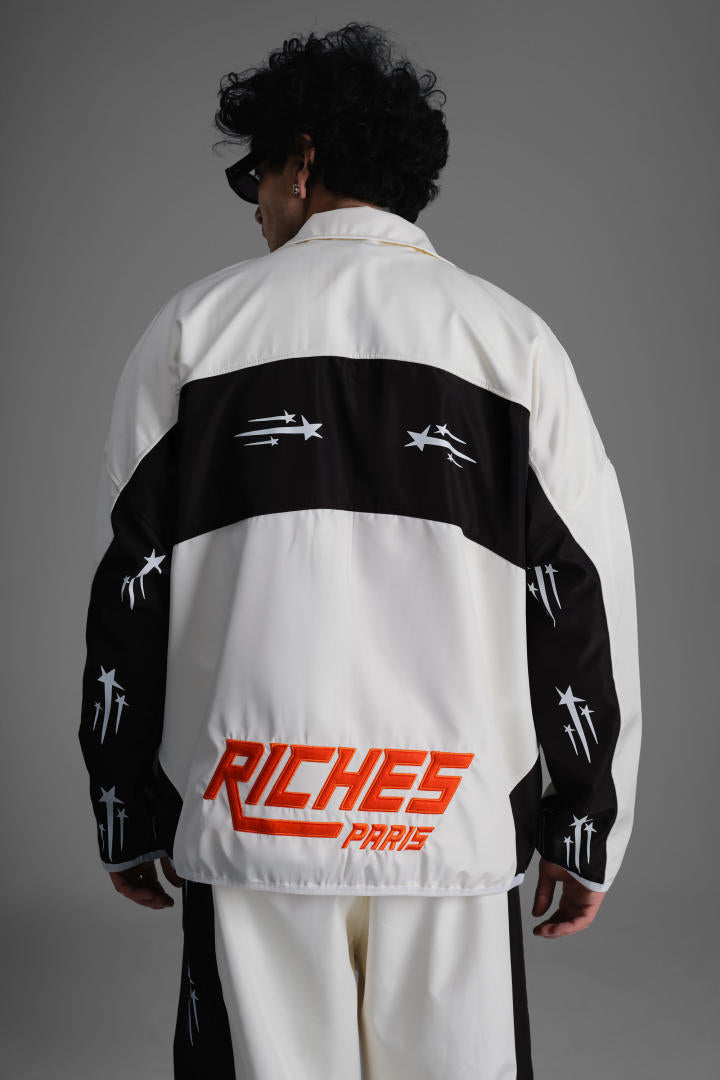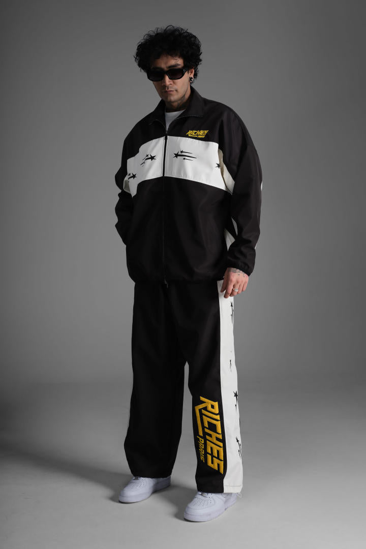 La veste zippée à col montant apporte une touche sportive, tandis que le pantalon assorti complète la silhouette avec un style affirmé. Les logos Riches Paris brodés et les détails étoilés renforcent son identité graphique.