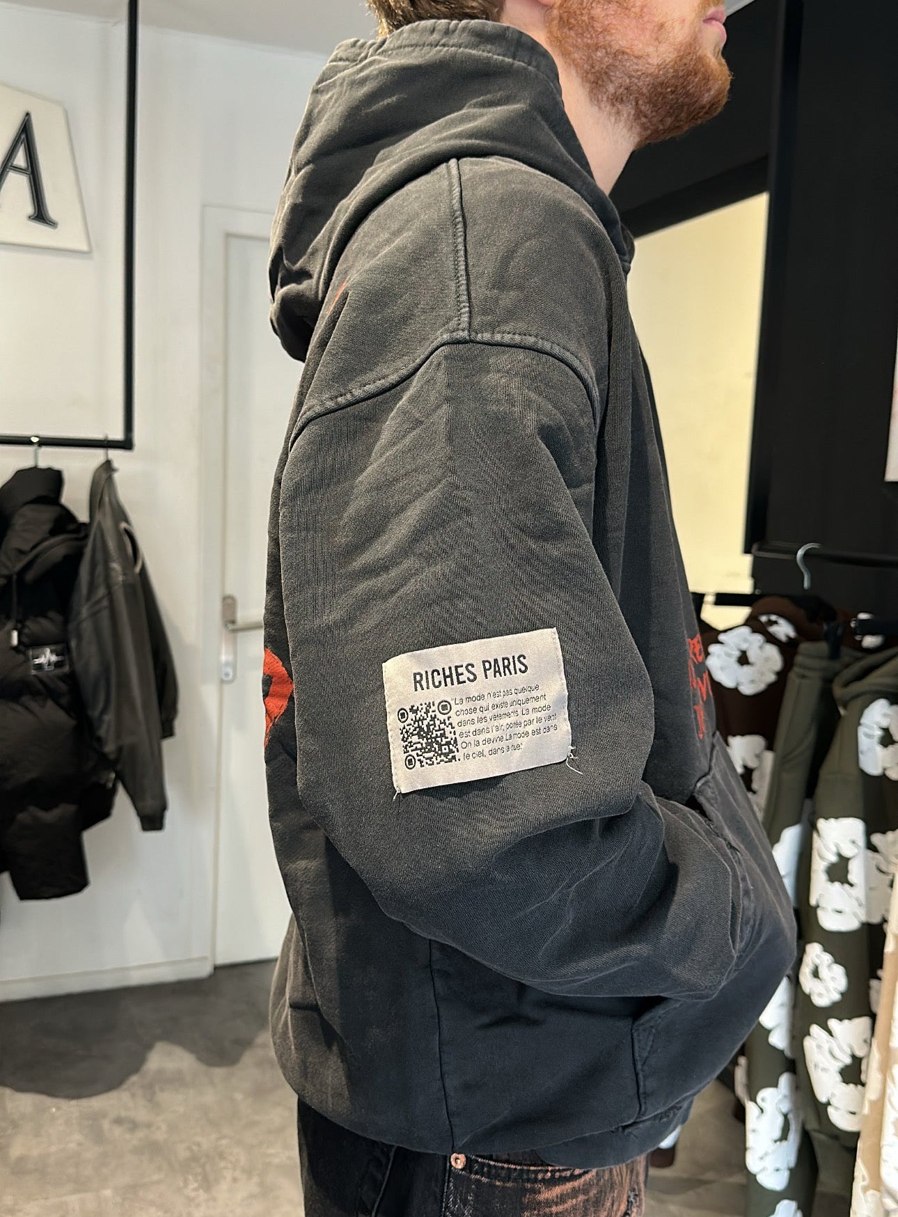 À l’avant, un marquage rouge discret rappelle le motto, tandis que le dos dévoile une version oversize du message pour un style affirmé. Une étiquette signature RICHES PARIS est cousue sur la manche, ajoutant une touche atelier unique.