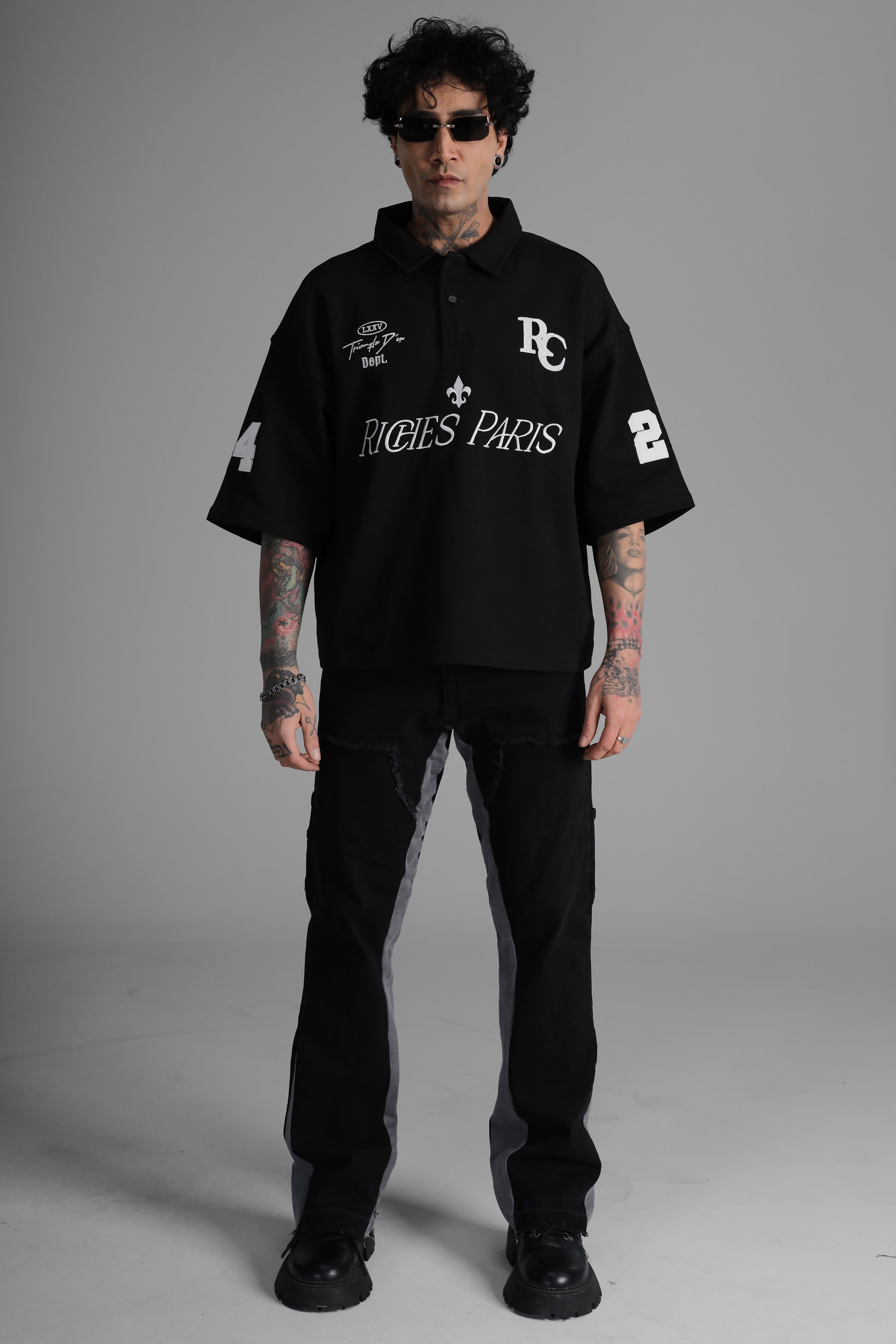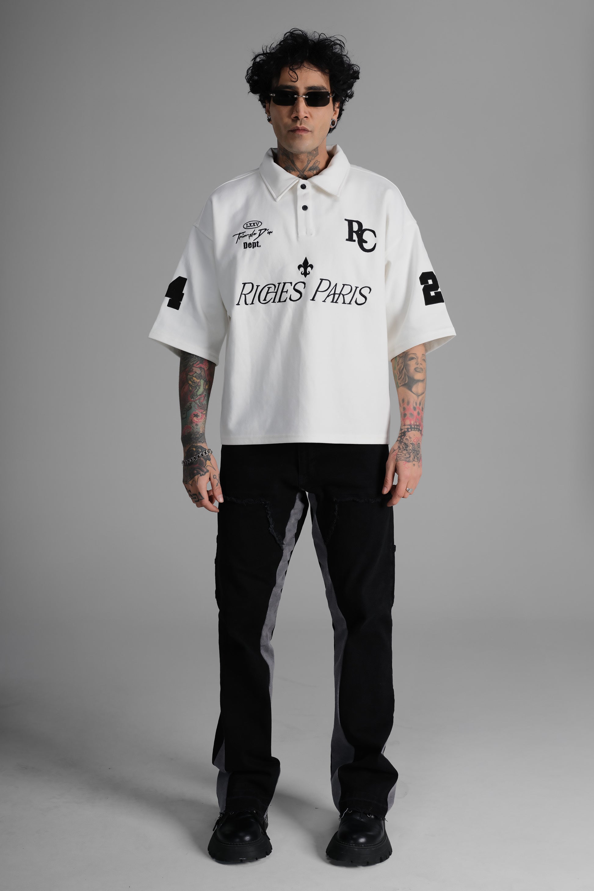 Ce polo Riches Paris revisite les codes classiques avec une esthétique street premium affirmée. Sa coupe oversize apporte une allure moderne et décontractée, tandis que le col polo boutonné structure la silhouette. Les marquages graphiques brodés et imprimés sur l’avant et les manches signent l’identité forte de la pièce, complétés par une étiquette signature au dos.