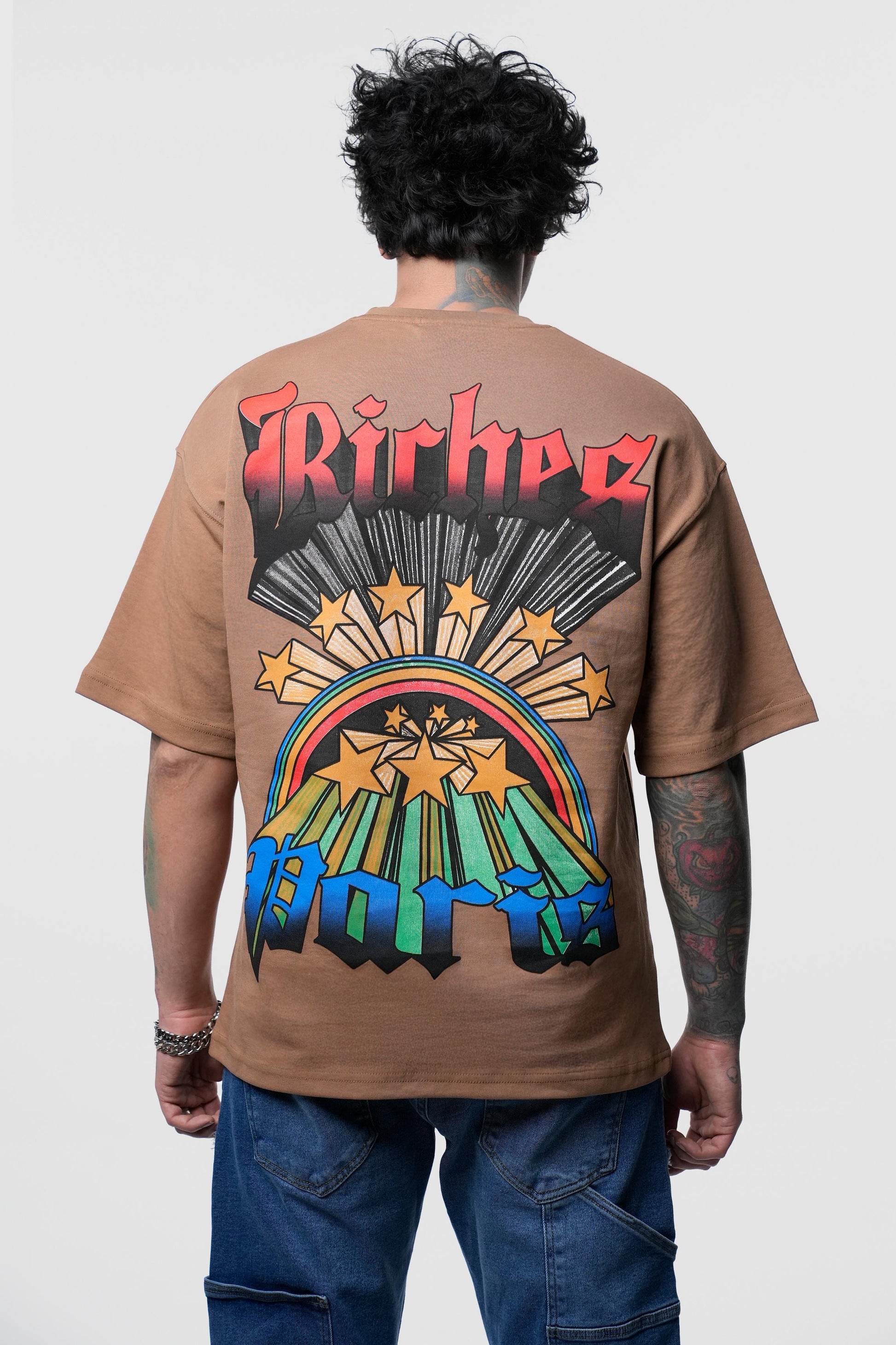 Ce tee camel oversize frappe fort avec un visuel XXL ultra vibrant dans le dos : dégradé rouge, étoiles dorées, arc multicolore et typo gothique “Riches Paris” pour un impact maximal. À l’avant, un rappel brodé sur la poitrine vient équilibrer le design.